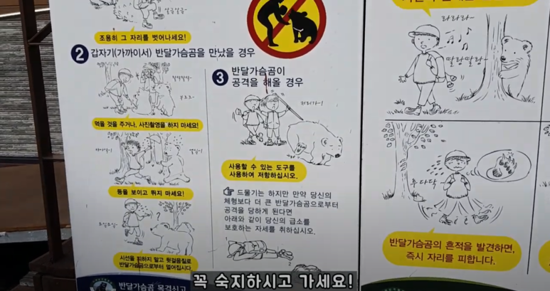 지리산 하면 반달가슴곰을 떠올리는 분들이 많을 것 같은데요. 역시 지리산 중간중간에는 이렇게 반달가슴곰을 만났을 때 어떻게 대처해야할 지에 대한 숙지사항들이 안내판으로 나와있습니다.