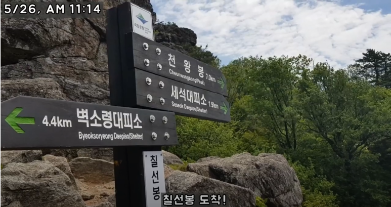 칠선봉에 도착했고, 세석대피소까지는 1.5km 남았습니다.